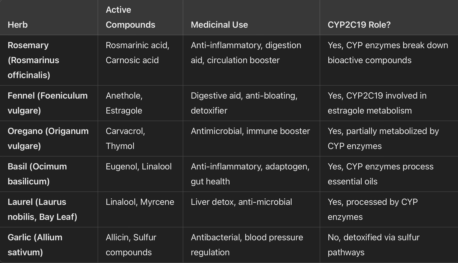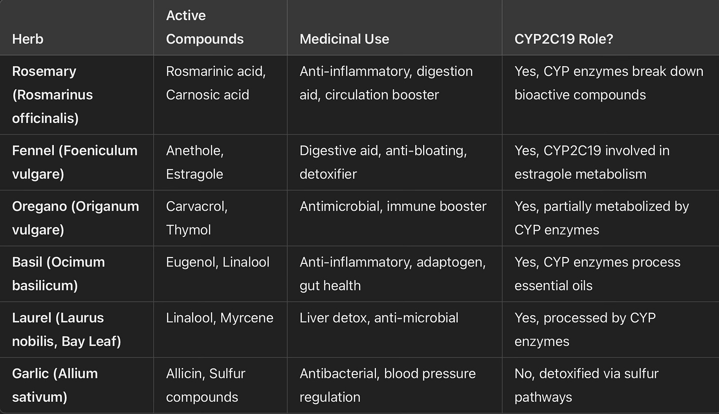 Before the advent of modern medicine, Italy was a hub of herbal healing, with monasteries, apothecaries, and folk traditions contributing to a robust system of plant-based medicine. Many of these medicinal herbs required CYP2C19 or other enzymes for metabolism and played a crucial role in treating illnesses. For example, rosemary contains rosmarinic acid and carnosic acid, which aid in inflammation and circulation, while fennel, rich in anethole and estragole, is known for its digestive benefits and detoxifying properties. Oregano, basil, laurel, and garlic also served medicinal purposes, with compounds that interacted with metabolic enzymes to exert their healing effects. These plants remain staples in Italian cuisine today, reinforcing the cultural connection between food and medicine.