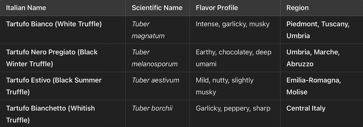 There are several types of Italian truffles, each with its own unique flavor profile and regional origin. For example, Tartufo Bianco (White Truffle), found in regions like Piedmont and Tuscany, is known for its intense, garlicky, and musky flavor. Tartufo Nero Pregiato (Black Winter Truffle), which is earthy, chocolatey, and umami-rich, is most commonly found in Umbria, Marche, and Abruzzo. The milder Tartufo Estivo (Black Summer Truffle) is native to Emilia-Romagna and Molise, while Tartufo Bianchetto (Whitish Truffle) from Central Italy has a garlicky, peppery sharpness. Among these, the rarest and most expensive is the White Truffle from Alba, which can cost thousands of dollars per pound.