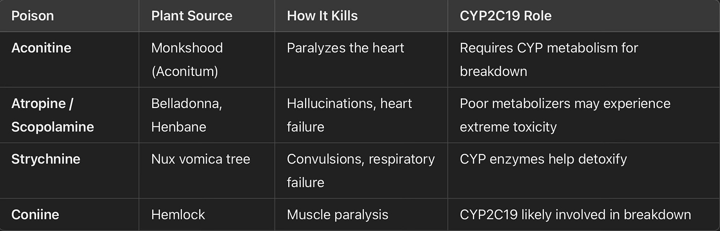 - Atropine & Scopolamine (Deadly Nightshade, Mandrake, Henbane) – Caused hallucinations and heart failure; CYP2C19 activity influenced individual susceptibility.
