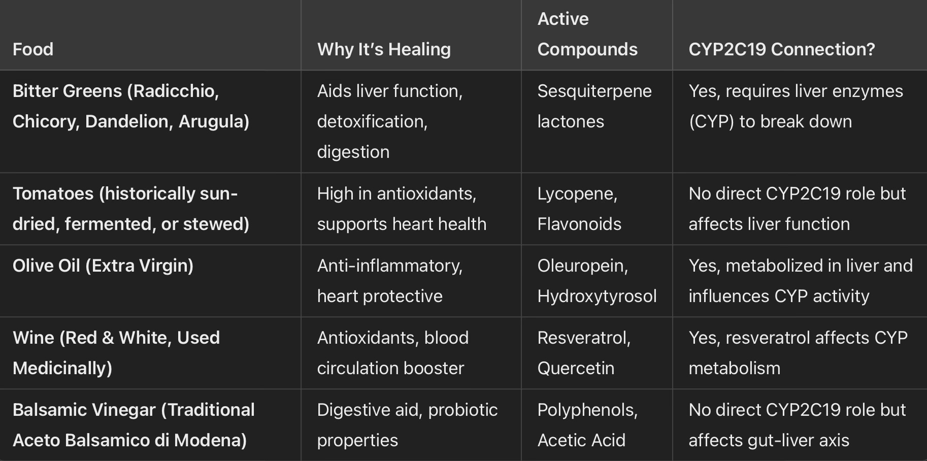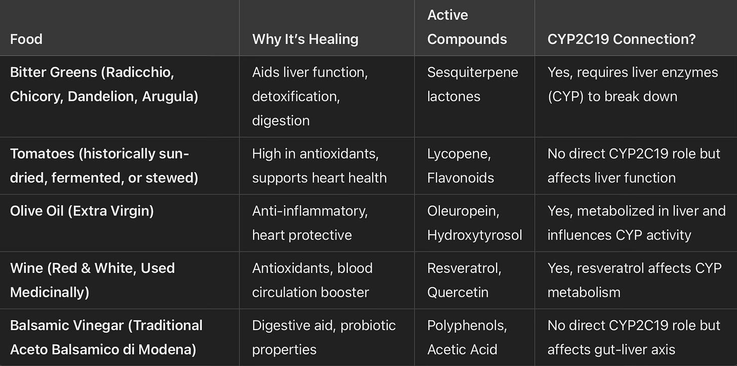 Beyond assassinations, the broader Italian and Mediterranean diet reflects an intricate history of food-as-medicine. Many of Italy’s revered ingredients contain bioactive compounds that interact with the CYP2C19 enzyme, influencing detoxification, metabolism, and overall resilience against dietary toxins.