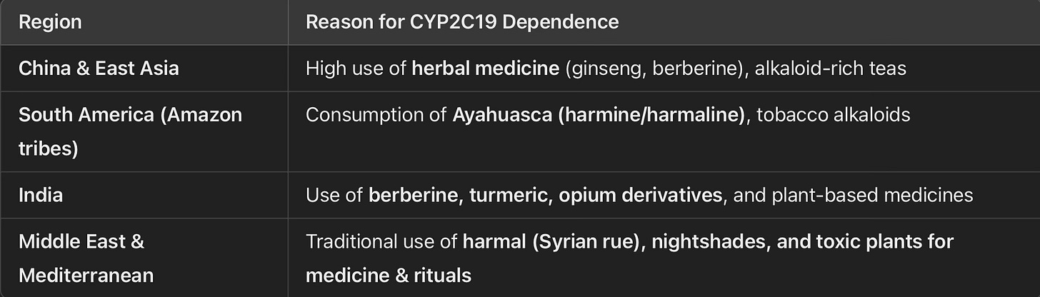 All these populations in these regions exhibit varying frequencies of CYP2C19 polymorphisms, likely shaped by long-term exposure to these alkaloid-containing plants through both diet and medicinal practices. Essentially, this enzyme is necessary for nearly every living process, reinforcing the argument that its significance is universal. Regardless of geographical location, polymorphisms related to this enzyme are primarily found in regions with prevalent religious or spiritual practices or where poison has historically been used as a tool for social dominance and warfare.