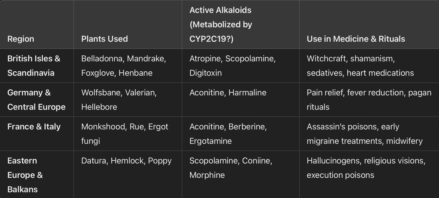 Europe has a deep-rooted history of medicinal and ritual plant use, particularly during the Middle Ages and Renaissance (500–1600 AD), when herbal pharmacology flourished. Monasteries and apothecaries played a crucial role in preserving and cultivating plant-based medicines, many of which relied on CYP2C19 metabolism for activation or detoxification. Plants such as foxglove (Digitalis) were widely used for heart conditions, while berberine from barberry and goldenseal served as an early antimicrobial treatment. Additionally, many European spiritual and healing traditions incorporated hallucinogenic plants, including belladonna, datura, and henbane, which were used in trance-inducing rituals and shamanistic practices. The metabolism of these alkaloid-rich plants varied among individuals, with some experiencing stronger effects due to genetic differences in CYP2C19 activity. The cultural significance of these plants was vast, shaping European medicine, folklore, and spiritual practices. While modern discussions on ethnobotany often highlight non-European traditions, it is important to recognize that Europe, too, had a complex and influential relationship with medicinal and psychoactive plants, influencing genetic and cultural adaptations over centuries.